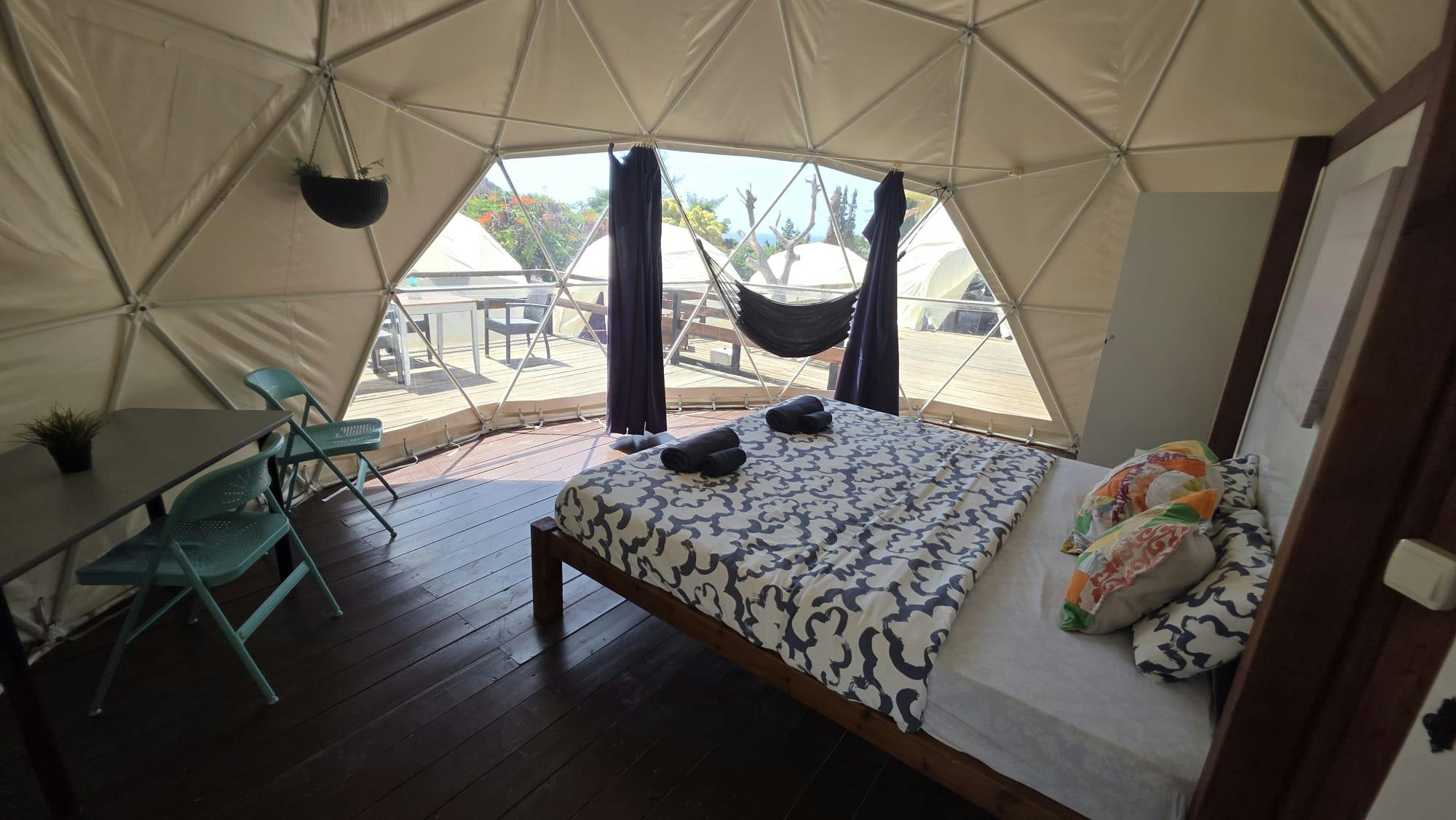 El fenómeno “Glamping” nace de la fusión de las palabras glamour y camping y se refiere a gozar de la libertad de acampar al aire libre sin renunciar al confort que nos ofrece un hotel de lujo. En el Blue Ocean Camp somos pioneros en Canarias y ofrecemos un alojamiento singular, cada vez más extendido en el mundo. Estas estructuras geométricas aportan una sensación de amplitud gracias a su diseño, ya que, al carecer de columnas, pilares y ángulos rectos, aportan al huésped la sensación de descansar en medio del espacio infinito.